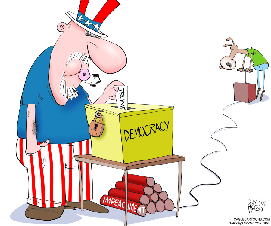 Here you see a cartoon about the current political situation in the U.S. Watch the video in the link and then describe what you think this cartoon is trying to say. What do you think about this message? (A donkey is the traditional symbol for the Democrats.)
